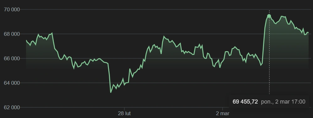 Cena bitcoina, po wcześniejszym spadku do okolic 63 tysięcy dolarów, gwałtownie odbiła w górę ponad 69 tysięcy, po czym zaczęła się stabilizować.